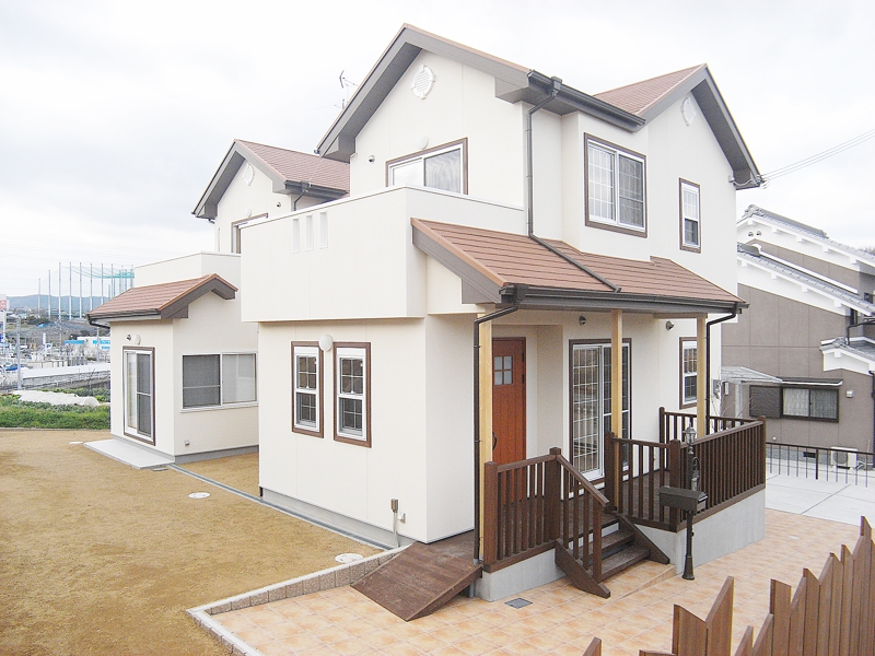 絆の家。デッキから導かれる玄関には、中庭が望め、その中庭を中心にLDK、和室、吹き抜けをプランニング。木肌の持つ色合いが家全体を包み、明るくそして風の吹き抜ける空間構成が魅力です。ご家族のコミュニケーションが自然に増えるように工夫された間取りは、家族を大切に思うお施主様の気持ちが表現されています。赤みがかった屋根と白い壁に木枠窓、こげ茶の窓枠やデッキなどがアクセントとなる南欧風の色彩が印象的です。