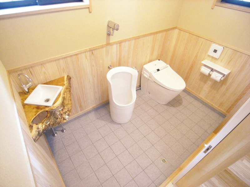 本格和風の家。和風建築伝統のいぶし銀瓦葺きの入母屋屋根が、風格を醸す本格木造住宅。広々とした玄関ホールは訪れる人へのおもてなしの心を表現しています。二間続きの和室には「出書院」や南面に広縁(ひろえん)を施し、木の質感溢れるLDKは落ち着きと安らぎを与えてくれます。